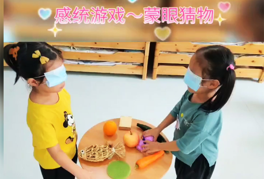 蒙上眼睛,原地轉(zhuǎn)三圈后走向箱子所在地,將手伸到箱子里去觸摸箱子里的東西。通過摸、聞等,描述你摸到的東西,最后說出你摸到的事物的名字。可以在箱子里放一些好玩的并且會(huì)讓人瞎想的物品,提升游戲的趣味,也可以提高大家的好奇心與參與的積極性。